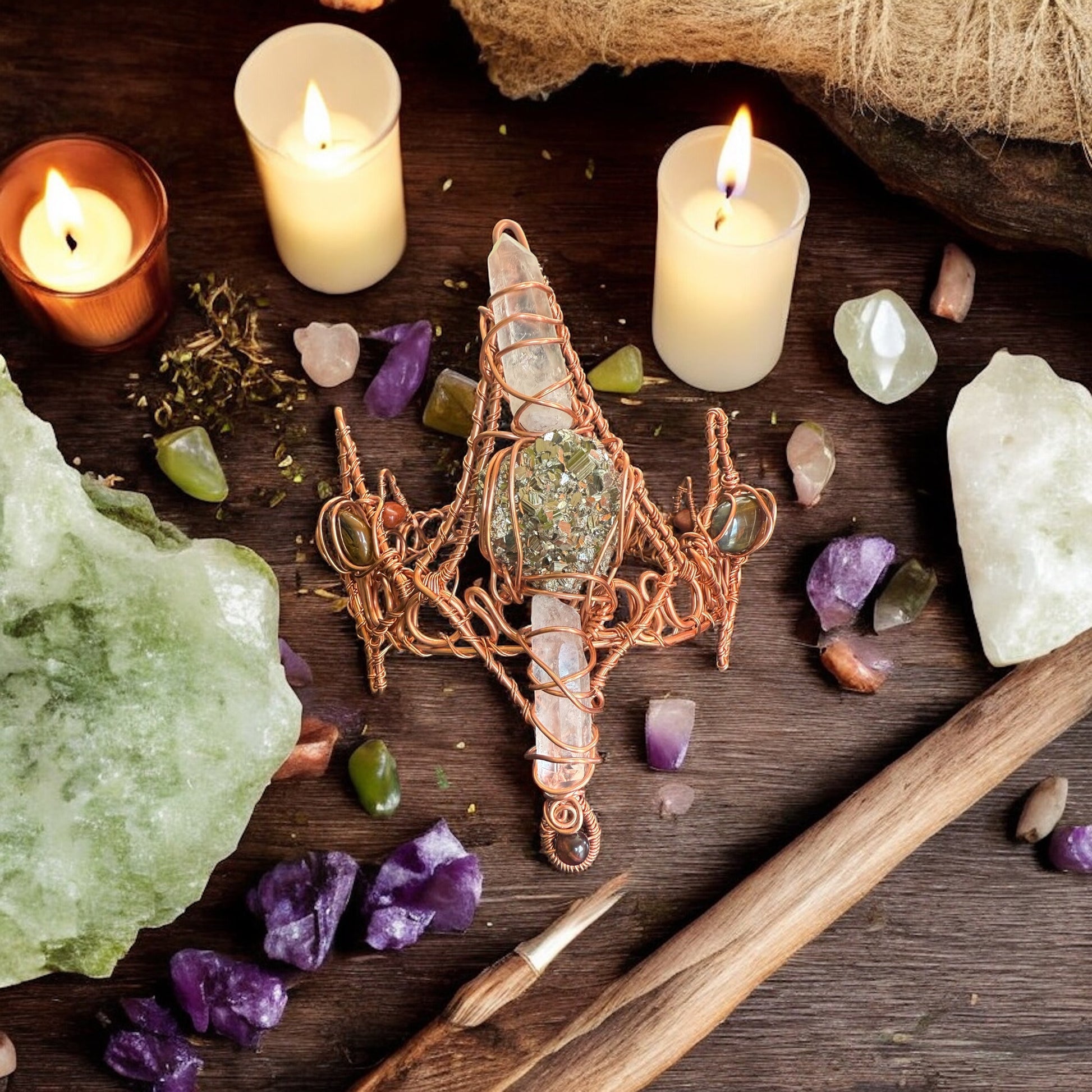 Elevate your style and energy with our Emperor Crown. Handcrafted with copper and adorned with pyrite, tigers eye, clear quartz, and red jasper, this powerful crown will enhance your aura and bring positive vibes to your day. Feel like royalty and attract abundance with this stunning piece.